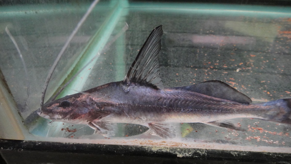 これも大好きなナマズです!普段は他のナマズに混じって小さいのがたまに輸入されるくらいのナマズなんですが、今回は大きめの個体が1匹だけ輸入されました!小さいのから飼い込まれた個体よりもこのサイズで輸入された個体の方が何故か顔付きが長く鋭いんですよね!体色の青味も濃く素晴らしいです!両方の胸ビレの棘がスレて先が短くなっていますが、歪んだり曲がったりはしていないので飼い込んであげればキレイに元通り再生すると思います!中段右の画像です。