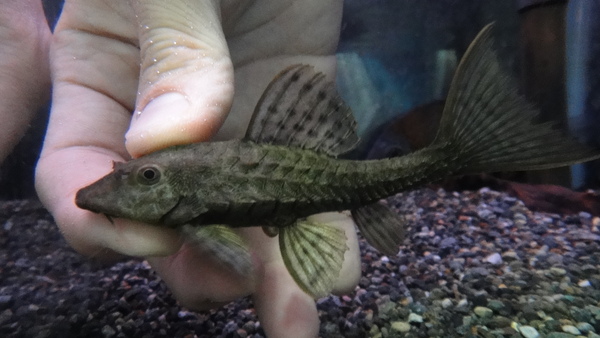 ちょっと地味ですが大人しくてコケも食べてくれる良いプレコです!歯が柔らかいのでアクリルにダメージが少ないのもオススメのポイントです!ずんぐりした体型がかわいく見えないこともない・・・かな?右下の画像です。