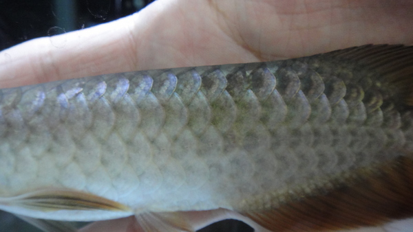 同じ血統の高背がもう1匹来ています!こっちもキレイで欠点など一切無い完品個体です!予算の都合で過背は買えないけど、上がりのいいアロワナが欲しいなぁ。なんていう方には超オススメ!この血統は当たればは背中まで巻いちゃう個体も全然います!最低でも5列目、運が良ければ6列目まで上がります!これは飼育環境や飼い方にも左右されますが、後は運!!宝くじじゃないですが、運が良ければ普通に過背金に化けちゃいますよ!!下段の画像です。画像が悪いですが、実物は顔もかっこいいし、スタイルも良いです!
