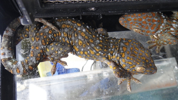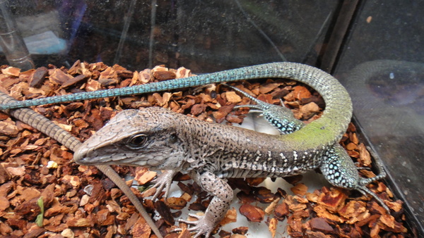 青い班が発色したキレイなオス個体ですが、残念なことに再生尾ですが状態は絶好調でよく太っています!丈夫で飼育しやすい良いトカゲですよ!