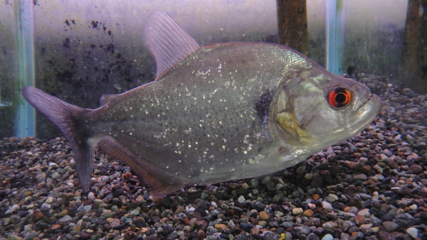 今年の6月にもアラグアイア産のダイヤモンドブラックが入荷しましたが、その時のはちょっと体色が黒っぽくて今回のとは別タイプと思われる個体でしたが、今回来たのは元祖タイプとでも言いましょうか、イメージ通りのこれぞダイヤモンドブラックという感じの個体です!前回のよりも体色は明るく、エラ蓋の辺りは黄色っぽく発色していて目は真っ赤です。前回入荷の別タイプの個体とは体色や体型が微妙に違いますので、気になる方は実物を見比べに来てください!どちらもキレイですごくかっこいいピラニアですよ!中段左の画像です。