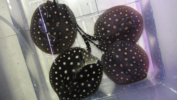 状態抜群!人工飼料をバクバク食べてる絶好調のダイヤポルカが入荷しました!国産で餌も人工飼料OKですからすごく飼い易いですよ!初めて淡水エイを飼育するという方にも自信を持ってオススメできます!今回入荷した個体の中でも大きめの個体はすでに黒の色も濃くなってきてスポットもはっきりしてきてます!小さめの個体もこれからスポットがどんどん増えてきてキレイになっていきますので成長につれての変化が楽しみですね!親個体はオスもメスもとってもキレイなので、今回入荷したベビーたちも将来はかなりキレイな個体になってくれるはずです!!