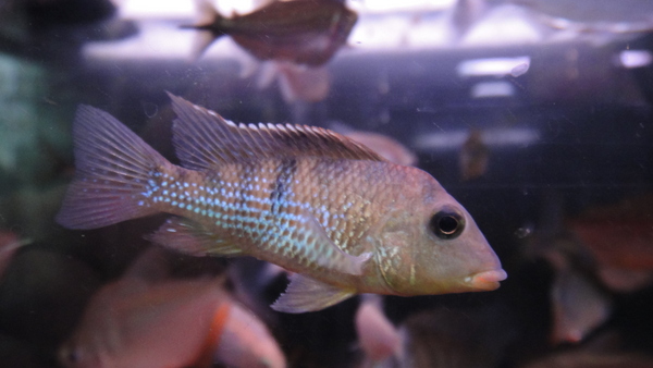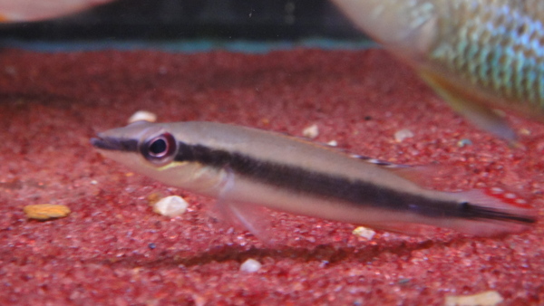 ドワーフパイクと呼ばれる大きくならないパイクシクリッドの1種です。性格も大型のパイクシクリッドよりも大人しく、比較的混泳もさせやすいです!中段右の画像です。画像の個体はメスです。