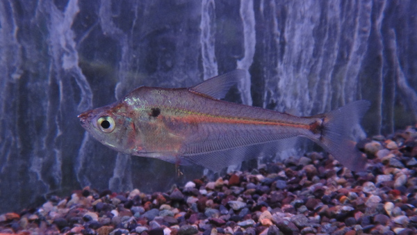 いつもサイカンガーのインボイスで入荷しますが、本当の種類はよくわかりません・・・。サイカンガーとかカラックスとかそれ系のカラシンですが、こいつスケールイーターなので混泳の際は要注意ですよ!プレコとかドラスとか、ナマズとかの底物との混泳は全く問題ありません。あと、今回3匹入荷したので一緒にしてみたんですが、どうやら同種同士も大丈夫みたいです。この魚スケールイーターだからなのか、全然売れないんですよ・・・。でも透明感のある体にメタリックグリーンのラインが入ってすごくキレイなんで個人的に大好きなんですよね。もともと2匹も在庫でいたのに、今回いつもより安かったからつい仕入れちゃった!しかも3匹も・・・。全然売れないのにどうしよう!?でもね、この魚うちの店にはいっぱいいますが、普段は滅多に輸入されないとても珍しい魚なんですよ!スケールイーターだから姉金とか入れるとすごい勢いで鱗を食べに襲い掛かるんですが、別に鱗を食べさせなくても普通に冷凍赤虫とか食べるので飼育も難しくないですし、良い魚ですよ!!