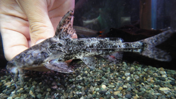 これは変わってます!トップフィンでロングフックなかっこいいパクーです!太バンドのバンデッドミレウスのバリエーションと思われますが、まだ小さくて太いバンドがはっきりしていないのと、現状ではバンドが2~3本見えますので、もしかしたら違う種類なのかも??ブラックバンドは小さい時はまだら模様で、そこから太いバンド1本に模様が変化していきますので、今回入荷のパクーの模様がどう変化するのか今から楽しみです!まぁ多分普通のブラックバンドの模様になると思いますけど・・・。模様は普通でもこのシルエットはかなりカッコいいと思いますよ!!入荷は2匹のみです!とりあえず問屋さんにいるの全部仕入れたんですが、もともと2匹しかいなかったので・・・。マニアの方はお急ぎください!早い者勝ちですよ!