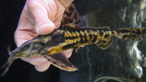 去年の12月にブラックフィンシルバーカラシンという名前で販売した謎のペルー産のカラシンがいたのですが、多分それと同じか、それに近い魚だと思います。産地はペルーとはずいぶん離れていますが、同じような魚がトカンチンス水系にもいたんですね。輸入元の話では15~20cm位になるそうなので、メチニスとか好きな方には超オススメですよ!前にきたペルー産のやつは大きかったので値段もそこそこ高かったですが、今回のは小さい分かなりお買い得です!複数匹入荷していますが、そんなにたくさんではありませんので気になる方はお早目に!!