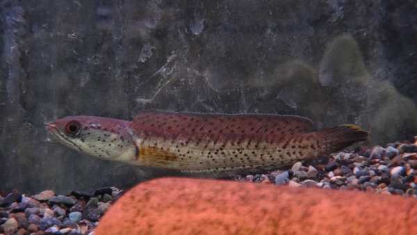 ピンクウナギかなんかかと思ってたんですが、来てみたらホタテウミヘビっぽい何かでした・・・。なんだろう、コレ??まぁ何かしらのウミヘビの仲間だと思いますが、ピンクウナギとかホタテウミヘビとかよりも頭が全然大きいんです。ちょっと正体不明ですが安いし面白い魚です。今のところ純淡水で飼育していますが、もしかしたら汽水の方がいいのかもしれませんね?こういうヘンテコな魚の好きな方いかがですか??