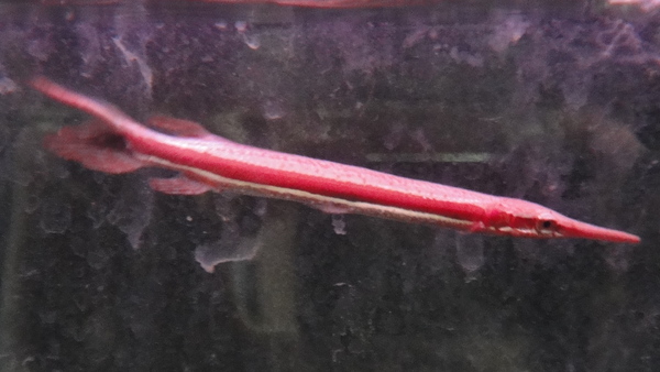 東南アジアブリードで現地からのインボイスは「レピソステウス”レッド”」だったそうです。問屋さんからは「なんか赤っぽいけどショートノーズガーでしょ、これ。」ということで入荷しました。確かに吻部は普通のスポガーに比べれば明らかに短く、現段階では体色が赤っぽいことを除けばショートノーズガーに見えますがどうなんでしょう??普通のショートノーズならもっと金色っぽい色をしてるはずだし、吻部は確かに短いですが、これがブリード個体であるが故だとすれば、この個体はショートではないのかも??幼魚色はスポガーもショートも体側に太いラインが入るということでは同じだし、成長につれて模様が消えてしまえばショートで、スポットに変化すればスポガーということなんですが・・・。ただこの色の赤さはなんなんでしょう??少し前に国内で流通した”レッドスポッテッドガー”なんていう名前の超高額な赤っぽいスポッテッドガーがいましたが、それの幼魚なんでしょうか??もしそうなら超ラッキー!この値段なら超激安ですね!ここ数年入荷が途絶えてしまっているショートノーズですから、ブリード個体でも手に入るならありがたいと思い仕入れてみましたが、入荷してみたら面白い魚でこれはこれでアリですね!しかも今回問屋さんにはほんのごく僅か、数匹しか輸入されていませんのでかなり貴重なガーですよ!当店もまとめて何匹か仕入れたいとお願いしましたが1匹しか譲ってもらえませんでした。なのでガーマニアの方は必見!お見逃しなく!上段の画像です。2つの画像は同一個体です。