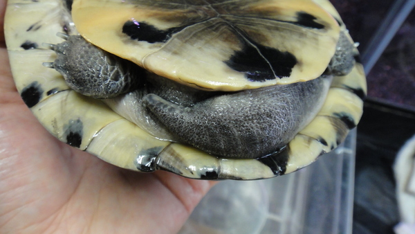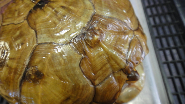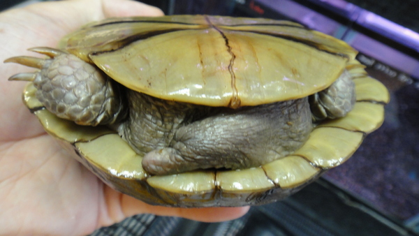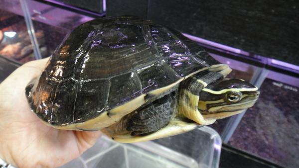 これも飼い込みの大きいのが入荷しました!顔に入った黄色いラインと甲羅の黒のカラーリングがキレイでかっこいいです!値段の割にすごく飼い易くて良いカメだと思います。最近は見る機会も減り、前みたいにいつでも手に入るカメではなくなりましたね。これもほんの少しですが尾の先が欠損していますがそれ以外に欠点はありません。そんなに気にならない程度だと思いますのでお買い得ですよ!