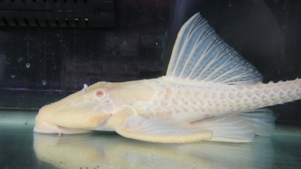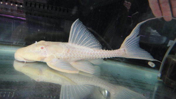 極美!!ビッグサイズのアルビノのアグアプレコが入荷です!以前に比べれば入荷量も増えて見る機会も多くなってきましたが、それは小さいサイズの話。こういうビッグな個体はそうはお目にかかれませんよ!ベビーから飼育した場合、20~25cm位まではけっこう順調に(順調といっても数年はかかりますけどね。)育ってくれる個体も多いですが、特にアルビノの場合はそっからの成長がかなりゆっくりになってしまいます。なのでこういう40近いようなサイズは本当に貴重ですよ!人工飼料もバクバク食べる個体で状態は抜群です!大型魚との混泳にもいいですね!プレコマニアの方だけでなく、アルビノやプラチナマニアの方にもオススメです!こんな立派なアルビノアグアはもう2度と入荷しないかもしれませんよ!