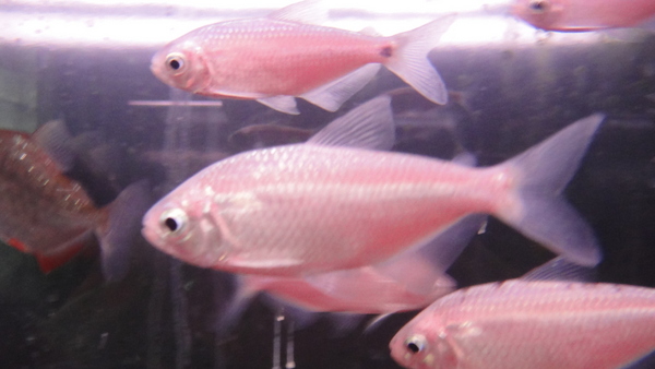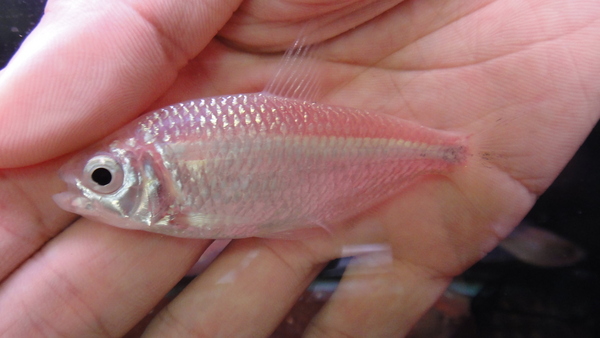 これはすごい!!こんなアスティアナックス初めて見ました!プラチナ系の変異個体でしょうか?よく分かりませんがかなりキレイで珍しい魚なのは間違いありません!体色はピカピカのプラチナシルバーで、背中や腹部など一部は皮膚が透けているためかピンクがかったように見えます。ストックしている水槽は下にガーネットストーンが敷いてあり、照明はフィッシュルクスを当てているので画像では実物よりピンクっぽく見えるかもしれませんが、とてもキレイで変わった体色です。輸入元によると今回7匹のみ国内に輸入されたそうで、全部買い占めてしまおうと思ったのですがすでに1匹は他のお店に売れてしまっていたので、残っていた6匹全部仕入れておきました!こんな不思議なアスティアナックスはもう来ないかもしれませんよ!?先天的な色彩変異なのか、それともこういう体色の種類なのか、詳細は不明ですがカラシンマニアは必見です!!次回の入荷は未定です!