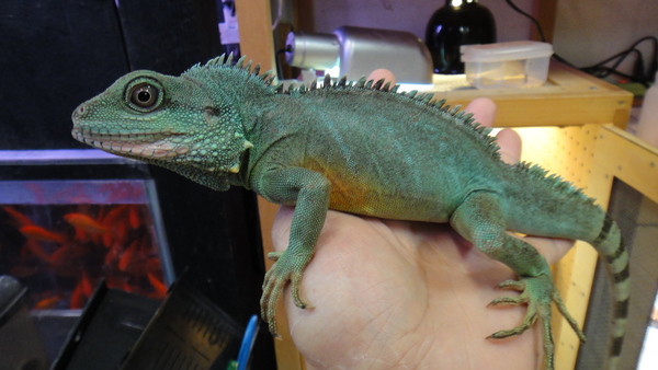こいつはお客様からの下取り個体なのですが、リッジテールモニターとか他のトカゲと同じ水槽で飼育してたらしいのですが、どうも怯えてしまってしっかり餌をたべられず痩せてしまったようです。現状かなり痩せてますが、単独にしたらバクバク餌を食べていますので、しばらくでブリブリになってくれると思います。尾切れや爪欠けはありません。けっこう黄色い個体なので仕上がったらかなりキレイになると思います。大特価ですのでどなたかかわいがってあげて下さい!
