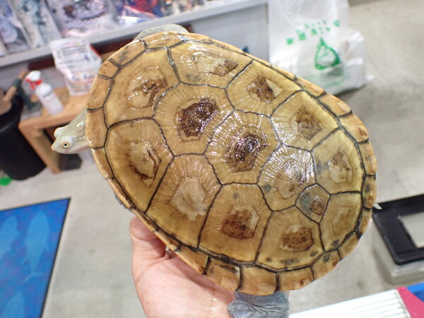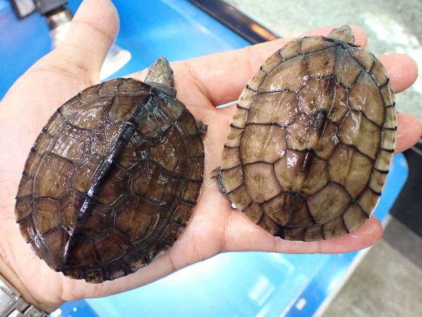 上段の画像の左側の黒っぽいのが甲欠けの個体です。甲欠けの具合は中段左の画像でご確認ください。