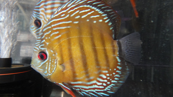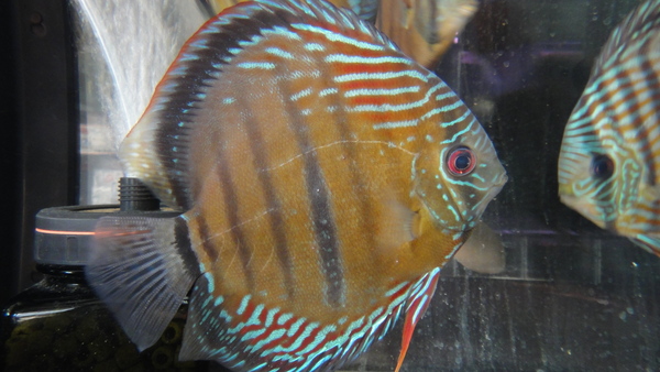 たぶんブラウンディスカスだと思います。間違ってたらごめんなさい。赤味の強いボディでこれもなかなかキレイです!3匹います。