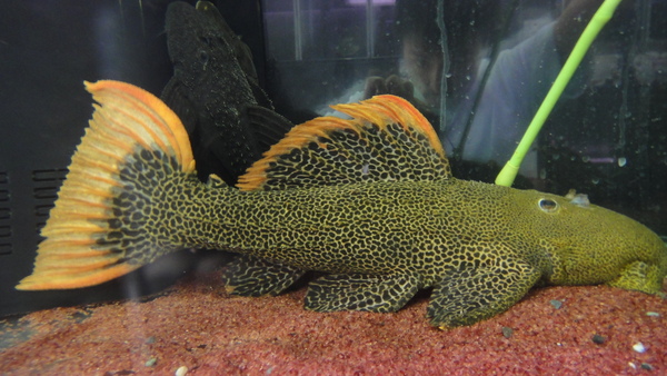 ロライマ産のスーパーオレンジフィンレオパードのお手本みたいなキレイな個体が入荷です!体側には黒くて細かいスポットがびっしりで、ヒレのオレンジは濃く発色しています。一目瞭然、普通のオレンジフィンレオパードとは全然違いますよ!!本物のロライマ産のスーパーオレンジフィンレオパードはとっても高価で入荷もすごく少ないんです!それにこのサイズなら普通はこの値段の倍はしますよ!今回大特価です、はセールにつきさらに大幅値引きです!ウルスカやスカーレットに比べるとちょっと人気が劣ってる感も否めませんが、それらに負けない位に派手でキレイなプレコです!!左上の画像です。