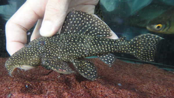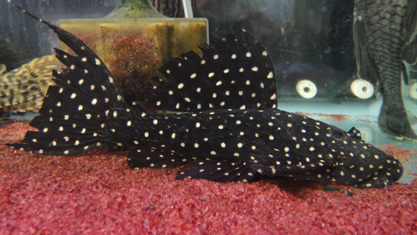 こんな激レアなプレコも来てます!クプープレコみたいに細長い面白いプレコです。全身が黒っぽく見えますがよく見るとスポット模様がびっしりです!さらに画像では分からないと思いますが、頭部には細かくて短い毛のようなトゲが生えているので光があたると銀色にビカビカ光ります!!滅多に輸入されない激レアなプレコですがちょっとマニアックすぎますかね・・・。かなりお買い得なんですけどね・・・。