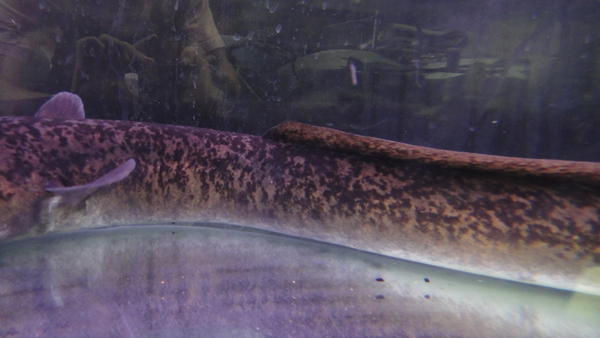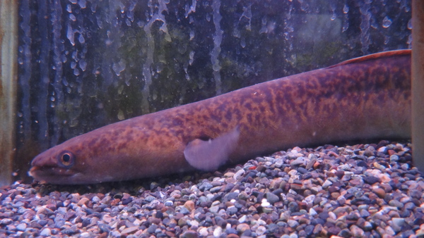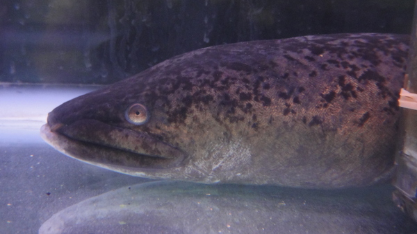 大きくて迫力のあるサイズのオオウナギですが、残念なことにちょっと痩せてます。なので頭が大きくてオオウナギにしては細く見えますね。それと両目とも黒目が小さいです。実はオオウナギは黒目の小さい個体が結構多いので、歪な形になってたり、左右で黒目のサイズが違うとかでなければ欠点にはならないと思うのですが、この個体はちょっと小さすぎかな・・・。まぁでも両目とも同じように小さいし、痩せてるのはしっかり餌を与えて飼い込んであげれば太く立派な個体になりますから、90cmクラスでこの値段は相当お買い得ですよ!ヒレが無いとか治らないようなキズがあるとかの明らかなB級品ではないのでかなりオススメです!完品のこのサイズならこの値段の2,5倍位はしますよ!なので安くて大きいオオウナギが欲しいという方はこの機会をお見逃しなく!!上段の画像です。2つの画像は同一個体です。