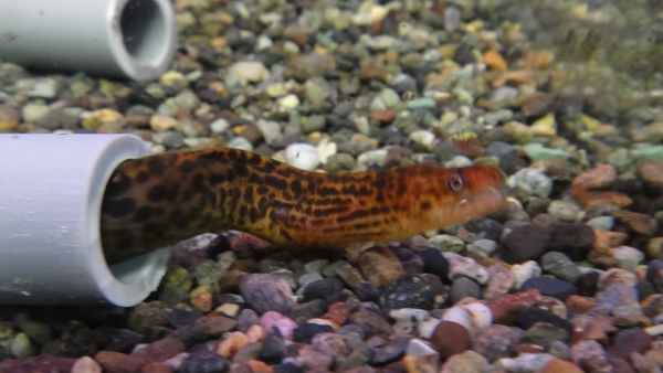 純淡水で終生飼育が可能なとても変わった体質のウツボです。名前の通りヒョウ柄がとてもキレイです!キレイな上にとても丈夫で、脱走されないように気をつければ飼育は全然難しくありません。餌もメダカなどの生き餌から冷凍赤虫まで生餌ならなんでもよく食べてくれますし、中には沈下性の人工飼料に餌付く個体もいますよ。入荷の少ない魚ですのでご興味のある方はお早目に!