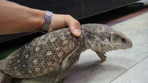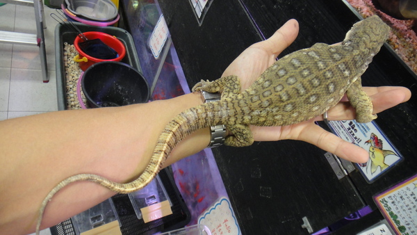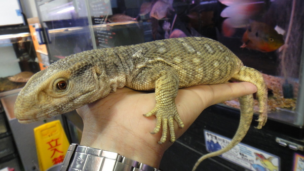 こっちも下取りの飼い込み個体です。後ろ足の爪が1本だけ欠けていますが、体色はパステルチックな薄い色合いでとてもキレイな個体です。こちらもブリブリで状態は良好です!しかもこの個体は超ベタ馴れですよ。良く馴れているし、サイズも頭胴長20cm位の安心サイズですので、大きなトカゲは飼ったことないという方にもオススメできます!中段右と下段の画像です。