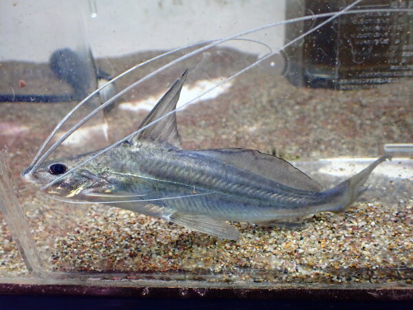 これは前回入荷したやつの残りです。ショートノーズのが来たからこっちはロングノーズと表記しておきます。入荷した時痩せてたからトリートメントしていた個体ですが、今は状態も問題ありません。最初にご購入いただいたマニアのお客さんとも少しお話しましたが、松坂さんが輸入してた時以来でかなり久しぶりに見たナマズだとおっしゃっていまして、自分も15年前とかかな?松坂さんから仕入れて以来見ていませんでした。当時はインディゴブルーピニランプスとかハイフィンブルーバックキャットとかホワイトマルチンスとかバルバードとかが普通にごちゃ混ぜで輸入されることもあったりで、松坂さんもけっこう適当だったから分けて売る時もあればごちゃ混ぜのまま売る時っもあって、宝くじというか宝探しというか、そういうのをわくわくしながら仕入れしてたのがちょっと懐かしいです。ちなみにこの魚はマリン企画の「世界のナマズ」に載ってます。世界のナマズにはサイズが50~60cmと書いてありますが、たぶんそんなに大きくならないと思います。ハイフィンブルーバックキャットとかと同じでなっても25cmとかじゃないかな?わかんないけど・・・。ロングノーズも在庫は最後の1匹です!次回の入荷予定はありませんのでマニアの方はお見逃しなく!左下の画像です。