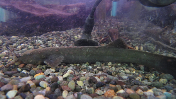 黒っぽいリーフナイフみたいなナマズです。あまり泳がず底でじっとしてたり、流木の陰でごろんと寝っ転がったりしてるナマズです。存在感はあまりないですが、そこがこいつのいところ!?