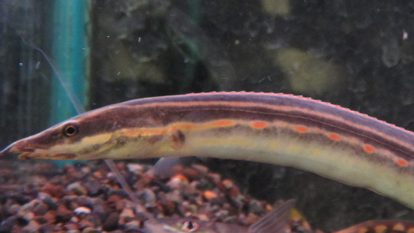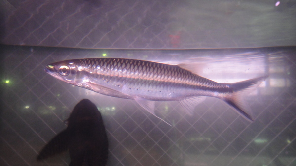 高い魚ではありませんが、最近は見かける機会が減りましたね。しかもこういう大きいサイズはなおさらです!スレンダーな体型がかっこいいし、目が金色に光り、体側にも金色のラインが入り何気に派手さもあります!本当は複数匹で混泳させたい魚なんですけど・・・、すいません1匹だけの入荷です。中型、大型のコイの仲間と混泳させてみるのもいいですね!