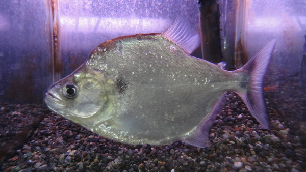 通常¥48000で販売していた個体ですが、背中に少しキズ痕があり、その部分だけ鱗の感じに違和感があります。キズそのものは完治しています。あと臀ビレの軟条に歪みがありますが、ヒレの形はキレイです。状態は良好で餌食いも抜群です。ラインノーズは今ではほとんど入荷の無い希少なピラニアで値段も数年前に比べてだいぶ高くなりました。今回ご紹介の個体は少々気になるところはありますが、このサイズの個体ではありえない位に激安です!!「ちょっとのことくらいは全然気にしないよ!」というお客様には超オススメです!!とりあえず画像でご確認下さい!