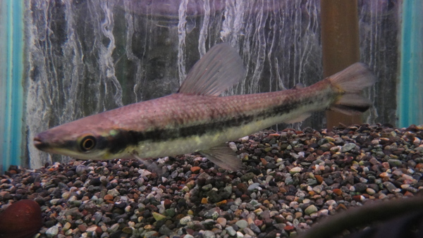 Rhytiodus microlepisです。当店初入荷!!超激レアな中型(?)カラシンです!かなり謎の魚なようで、学名で検索してもほとんど情報がでてきません。アノストムスとかレポリヌスとかパロドンとかそういうのを足して割ったような細身のカラシンです。最大サイズも謎ですが魅力的なカラシンであることは間違いないでしょう!?目の上がオレンジで体側は茶色っぽい感じです。派手さはないですがインパクトのある魚です!サイズも大きくてけっこう迫力あります!!カラシンマニアの方いかがですか?もちろん1匹のみです!!中段右の画像です。