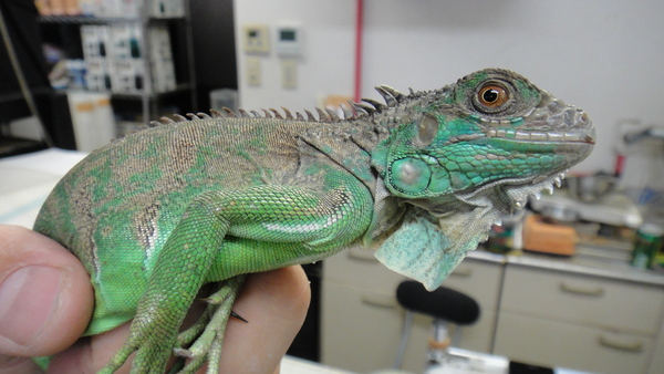 別に仕入れるつもりは無かったんですが、問屋さんにたくさん入荷した黄緑のイグアナの中に1匹だけ青緑のイグアナを見つけたのでついつい仕入れてきちゃいました。1匹で見てもあんまり伝わらないかもしれませんが、同時に輸入された他の個体とは明らかに色が違いました!!アザンのブルーイグアナみたいな青ではありませんが、青味の強い体色ですごくキレイです!大きくなっても青っぽい色のままでいてくれたらいいんですけど、どうなるかは育ててみてのお楽しみ!かなりオススメです!ただし、イグアナはとっても大きくなるトカゲですから最後まで飼い続けられる方にお願いしますね!右下の画像です。