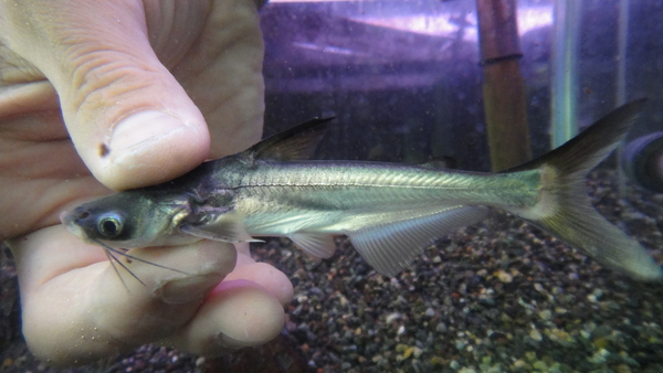 バングラディッシュ産の謎のパンガシウスです。目の周りが鮮やかな水色でとってもキレイです!パンガシウスなのでそこそこのサイズにはなると思いますが詳細は不明です。こういうアジア産のsp物は入荷が1回きりでその後何年も輸入されないなんていうことはよくありますので、お好きな方はお早目に!パンガシウスみたいな人気も知名度も微妙な魚は特にそういう傾向がありますのでこれを逃すと次はいつになるか分かりません!!これが南米産の例えばゼブラキャットとかバンピラみたいなかっこいい人気のあるナマズの変わった個体とかだとたくさんいても売れるから問屋も現地のシッパーもがんばって集めてくれるんですけどねぇ、パンガシウスだとなかなか・・・。1匹のみです!