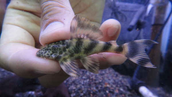 頭にスポットが入り、体側には太いバンドがはいり、スポット模様とバンド模様が両方楽しめるお得なプレコです!