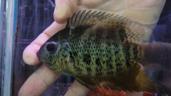 やっと来ました!!もう何年も入荷していなかったと思います。個人的に大好きな魚なのでずっと待ちわびていました!ただしサイズが小さすぎて本物の確約はできませんので悪しからず・・・。でも現地からのインボイスはBangana behriでしたし、小さいですがうっすらおでこが出ていて体色も独特の緑がかった光沢があり本物の面影はあります。なのでかなり期待できると思いますよ!!この魚をあまり知らない方は学名で画像検索してみてください!一目でとりこになりますよ!かなり久しぶりの入荷ですし、大型個体ではそれなりに高価ですから、この価格はかなりお買い得です!次回入荷は全くの未定です!なので問屋さんに残っていた分は全部買い占めました!ちなみに今回輸入された数は全部で14~15匹だけだったそうですが、そのうち当店に入荷したのは7匹だけです。なので興味のある方はお早目に!!絶対オススメ!!