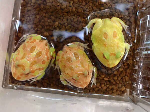 かわいいサイズのアルビノクランウェルです。ライムグリーンアルビノと呼ばれるちょっと緑がかった黄色のやつとアプリコットアルビノと呼ばれるちょっと赤っぽいオレンジのやつといますのでお好きな方をどうぞ!右下の画像です。