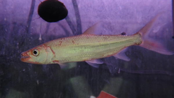 入荷の少ない大型アフリカンカラシンです!まだ小さいですが、最大では40~50cmにもなるらしいです。まぁそんなに大きいのは見たことありませんし、水槽内でどこまで大きくなるのかは分かりませんが・・・。パーカーホやヘテロティスのようなベントス食の魚なので赤虫や粒の細かい人工飼料をこまめに給餌する必要があります。痩せないように餌やりに努めましょう!