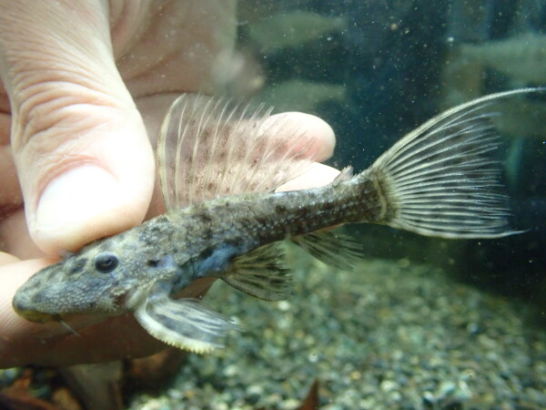トリムプレコの中ではちょっと地味目な種類ですが、成長すると太くがっしりした体型になって棘もすごく発達するかっこいい種類です。個体や産地によっては体色が黄色っぽい明るい黄土色になるやつとか尾ビレや背ビレの太い条がオレンジになるのとかけっこうバリエーションがあったりもします。ちなみに前からの在庫で20cmくらいで¥29800の個体も1匹いますので大きいの欲しい方はお問い合わせください。20cmでこの値段はかなりお買い得だと思います。右上が今回入荷した9cmの個体の画像で中段左が前から在庫してる20cmくらいの個体の画像です。