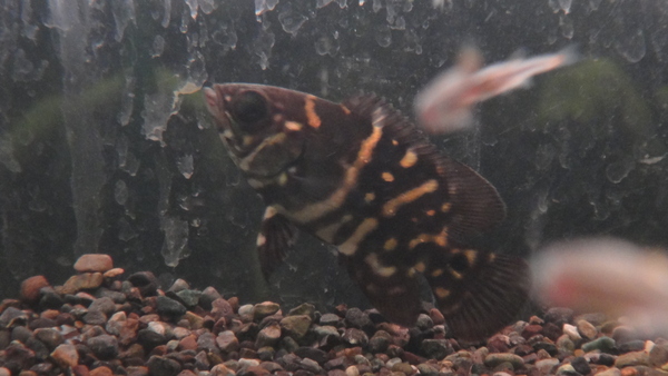 シングー川上流域の支流ジャトバ川産のオスカーです。種類はオルビクラトゥスだと思いますが、背ビレのあたりにオセラータスのような黒い模様の入ったちょっと変わったおもしろい個体です!右上の画像です。