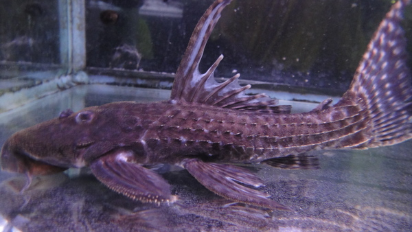 来ました!!最大のプレコ、アカリエスピーニョです!アカリはブラジル政府により輸出規制がかけられていますので流通量が激減してしまい今ではほとんど目にする機会が無くなってしまいました。本当に幻になりつつある激レアプレコです!頭部に生えた細かい棘が金色に光りすごくキレイです。もちろん入荷の個体も頭キンキンです!背ビレも高く、尾筒も太くしっかりしているのでそのシルエットもすごくかっこいいんです!ヒレに欠けている部分がありますが完治する程度です。マニアの方は必見です!次回入荷は全くの未定ですのでお早目に!!1匹のみです!
