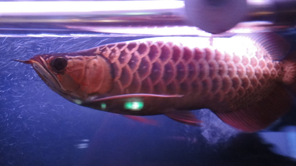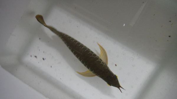 スタイル抜群!!超極上のショート過背金の入荷です!まっすぐ伸びた長いヒゲ、反り返ったスプーンヘッド、ぐんと盛り上がった肩、厚い体高、長く大きい各ヒレ、ショートでありながら歪みや凹み、鱗の乱れなど一切ないパーフェクトな個体です!もちろん目垂れ、アゴずれ、エラ捲れのない完品です!過背金は神経質な個体が多い気がしますが、この個体は餌食いもよく物怖じしない性格なのでとても育てやすいと思います。あまりキレイな写真が撮れなかったのですが、実物は画像よりももっと青く、全然キレイでかっこいいです!当店の看板魚にしようと思い仕入れた個体なので正直あまり売りたくないのですが、ご興味のある方はお問い合わせください。この体型で大きく育ったら相当な迫力の超イカツイ過背金に育つと思います!!