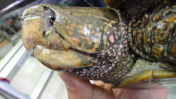 入荷が激減で超貴重なシウイオオアタマの大型個体が入荷です!しかも尾切れ、爪欠け、甲ズレのない完品です!色もキレイで、背甲はオレンジっぽい赤茶色で良く見るとオレンジやピンクのスポットがびっしりです。顔や首、四肢にもキレイなスポットがしっかり出ていますので、かなり良い個体だと思います!!国内に輸入されてからしばらく飼い込まれた個体なので状態も抜群で、餌も人工飼料に餌付いていますので安心です!シウイのしかもこのサイズで完品なんてそうは手に入りませんよ!もちろん1匹のみです!!