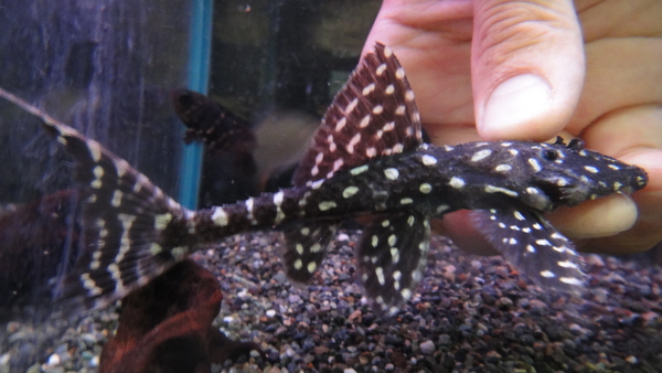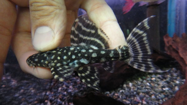 以前はトリムプレコの仲間の中でも入荷の多いポピュラーな種でしたが、今では入荷が激減し入手の難しい魚になってしまいました。黒地にホワイトスポットが入るキレイなプレコですが、今回入荷の個体はスポットは大き目で、ヒレにははっきりと白いバンド模様が入った超極美個体です!かなりハイクオリイティなホワイトスポットアカリだと思いますよ!入荷は少数のみですのでお早目に!左下の画像