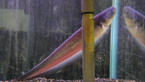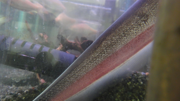 こんなナイフ初めて見ました!!超レアな謎のナイフが入荷です!ピンクドルフィンナイフのインボイスで入荷しましたが、ドルフィンナイフとは全然違う魚です。ダックビルナイフなど全身が淡いピンク色のナイフはいますが、今回入荷したこのピンクドルフィンは背部や頭などは青灰色で、腹部だけ濃いピンク色です。着色したんじゃないのかと疑いたくなりような強烈なピンクです!最大サイズなど詳細は不明ですが、ナイフマニアの方にはたまらない魚ではないでしょうか?11日(火)に入荷したのですが、もうメダカを食べています!状態も良く、よく太っています!顔も悪そうなふてぶてしい顔で、なんとも魅力的な魚ですね!入荷は1匹のみですのでお早目に!