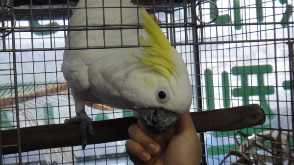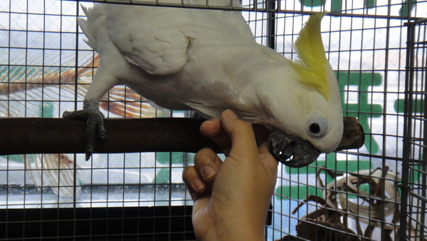 国内ブリードの1歳の超ベタ馴れのアオメキバタンが入荷です。実は2週間位前に入荷していて、今ではすっかり環境にも慣れたようで元気いっぱいです!当店は熱帯魚屋なんですが、猛禽類やこんな鳥もたまに入荷します。目の周りの羽毛の生えていない部分がうっすら青っぽいのでアオメキバタンです。実際に瞳が青いわけではありません・・・。そんなことはどうでもいいのですが、この個体は本当に良い子でベタベタに馴れています!!ケージのそばに行けば寄ってきて頭を出して”いいこいいこ”の催促をしてきますし、ケージの扉を開ければ体を傾けながら翼を持ち上げて脇の下の”いいこいいこ”を催促してきます!人を選ばず誰にでも懐いているのですが、気に入った相手ならケージから出て肩に乗ってきて鳥の方から頬擦りしてきます!こんなに良く馴れたキバタンは今までで初めてです!本当にスキンシップの好きな甘えん坊なので鳥との時間をしっかりとってあげられる方にオススメです!ゴニョゴニョとおしゃべりの練習(?)もしていますし、まだまだ上手ではありませんが、たまに「コンニチハ」っぽい感じの言葉をしゃべっていますので、教えてあげれば簡単な言葉ならおしゃべりしてくれると思います。餌はマズリーのオウム用ペレットとリンゴ等の果物を与えています。