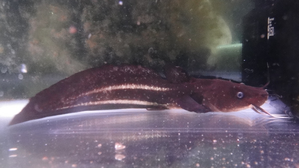 Plotosus papuensis です。超激レアのイールキャットで、過去に1度きり輸入されたことがあっただけのものすごく珍しいナマズです!国内へ輸入はおそらく2例目になると思います。かなりマニアックなナマズなのでこの魚を探していたという方や、このナマズを知っていたという方もそうはいないとは思いますが、もしこの魚をよく知ってるとか、すごく欲しいとか、そんな人がいたら超変態マニアですね(いい意味で?!)。タンダンキャットやシーキャット系のマニアの方は必見です!パプアニューギニアに分布するゴンズイ科のナマズですが、本種は純淡水域に生息しているため飼育の際にも塩分は一切必要ありません!最大で70cm位だと思われますが、成長すると頭が大きくなりものすごく奇怪な風貌のナマズになります!1匹のみです!!上段の画像です。2つの画像は同一個体です。