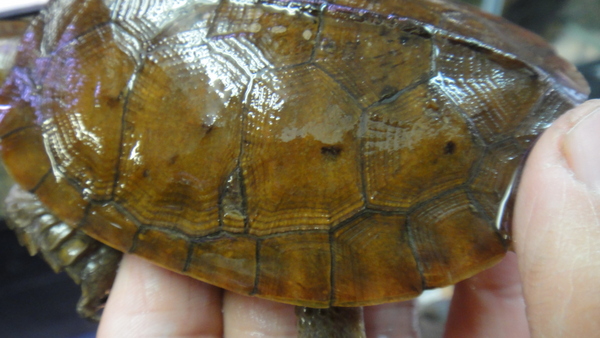 オレンジ色のすごくキレイな個体なのですが、残念なことに軽微な多甲板です。よく見ないとわからない感じの小さな多甲板なのでこの値段ならお買い得だと思います!!それ以外には欠点はありません!状態も問題なく、人工飼料をよく食べます!ここ最近は選べるほどのオオアタマガメは入ってきていませんのでこの位の多甲板なら買いだと思います!