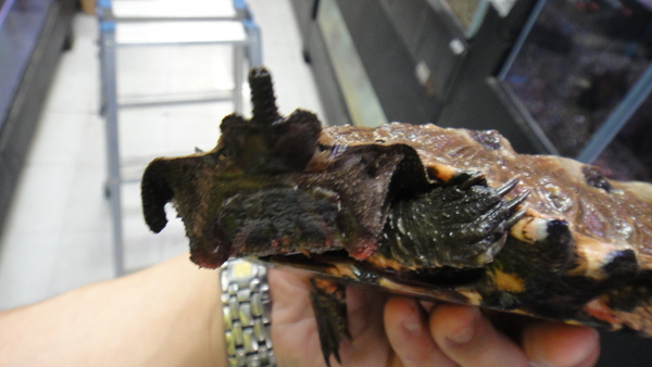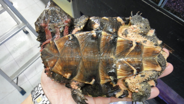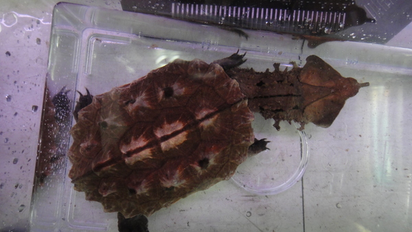 産地はよくわかりませんが大きめで迫力のあるサイズのマタマタが入荷しました!甲長は15cm位ですが、首が長く頭も大きいので全長では30cm近くありそうです!もちろん完品でキズや甲ズレ、爪とびはありません!状態も良好でオススメの個体です!小さめの方がいいという方には甲長7~8cm位のガイアナ産の顔の黒いブラックタイプの個体も在庫ございます。
