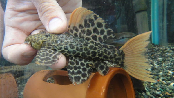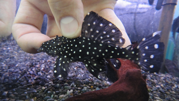 真っ黒に真っ白のスポットの入ったキレイで人気のプレコです!トリム系の種類ほどではありませんがこの仲間もトゲトゲしていてけっこうかっこいいです!