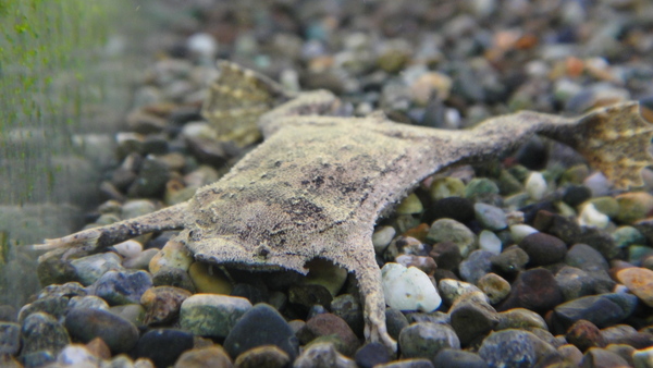 コモリガエルとも呼ばれる平べったいカエルで、その奇怪な容姿とふざけた名前で有名なカエルです!完全な水棲のカエルで、丈夫で飼育は簡単です。口に入る魚はバクバク食べてしまいますが、口に入らないサイズで大人しい魚となら混泳も可能で、一緒に入荷したバンピラと同じ水槽に入っていてアカヒレを食べています。繁殖形態がおもしろい種で、メスが産み落とした卵をオスがメスの背中にのせてメスが卵を背負うのですが、その卵は完全に皮膚に埋もれてしまいます。卵が孵るとオタマジャクシではなく仔蛙としてメスの背中の皮膚を突き破って次々と出てきます。その姿はとんでもなく、恐ろしいほどに気持ち悪く、もうほとんどホラー映像です!繁殖は難しくなく、国内での繁殖例もありますので気持ちい悪いのが好きな方はチャレンジしてみてください!