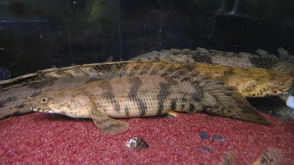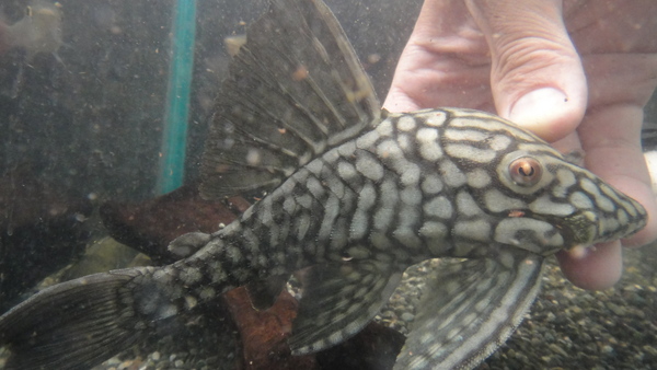 トゲトゲしていて、額のあたりには角みたいな突起があってかなりカッコいいシルエットのプレコです!グレーの体にブラックスポットが入り、体色も渋くて良いです!!