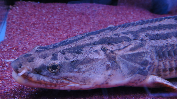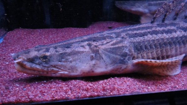 サイズは50cmとしましたがこの個体ももう少し大きいかもしれません。また、上記の個体より長さは少し短いですが太さはこっちの個体の方が少し太くてすごく迫力があります。模様も全体の体色が濃い個体なので、黒底の水槽で飼い込めば濃い緑色が発色すると思います。しかも背ビレも16本ありますので飼い込んで色が出ればトゥルカナのビキールにも見劣りしない素晴らしい個体に仕上がると思います!ただし、現状尾ビレの一部に裂けている部分があります。少しづつ再生してきていますので問題は無いと思いますが、気になる方は画像でご確認ください。