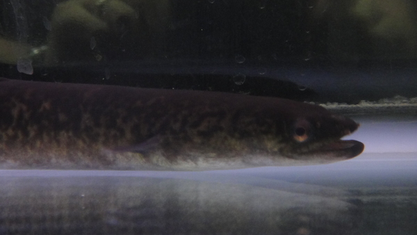 インドネシア産のオオウナギです。分布域を考えればアンギラセレベセンシスになると思うのですが、見た目は奄美産や沖縄産と同じマルモラータ種に似ています。セレベセンシスはなんとなく黄色っぽいというか茶色っぽい感じの個体が多い気がしますが、今回のは緑っぽい感じで奄美産で入荷するオオウナギに雰囲気がよく似ています。まぁ、セレベとマルモを外見だけで識別することはかなり難しいと思いますし、この仲間は海にでて繁殖をするという性質のため分布域を大きく外れた地域で生息が確認されることも多々あります。まぁ、マルモでもセレベでも大きくなってかっこよくなればいいですよね??左上の画像です。